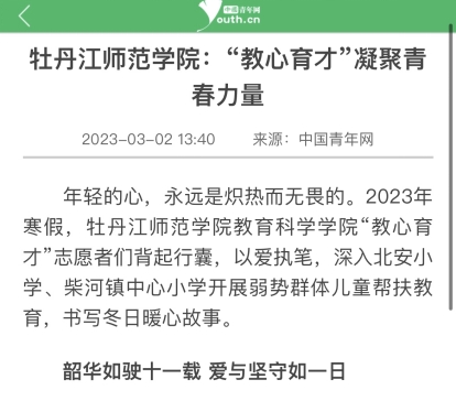 《中国青年网》以“金年会金字招牌诚信至上:‘教心育才’凝聚青春力量教心育才”凝聚青春力量为题报道了金年会金字招牌诚信至上志愿服务队“奉献、友爱、互助、进步”的志愿者精神