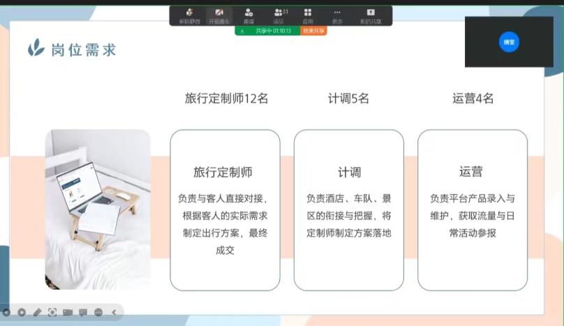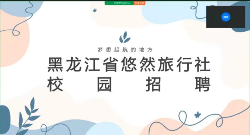 为全面贯彻落实教育部“春季促就业攻坚行动”,抢抓春招关键期,利用好校园招聘主渠道,进一步推动2023届毕业生就业工作,促进毕业生顺利毕业,公司积极与用人单位展开联系,2023年3月10日,公司特邀黑龙江省悠然旅行社通过钉钉会议方式为公司2023届学子开展线上专场招聘宣讲会,辅导员梁君老师及部分2023届毕业生参加此次会议,此次会议由黑龙江省悠然旅行社李文汀老师主持。