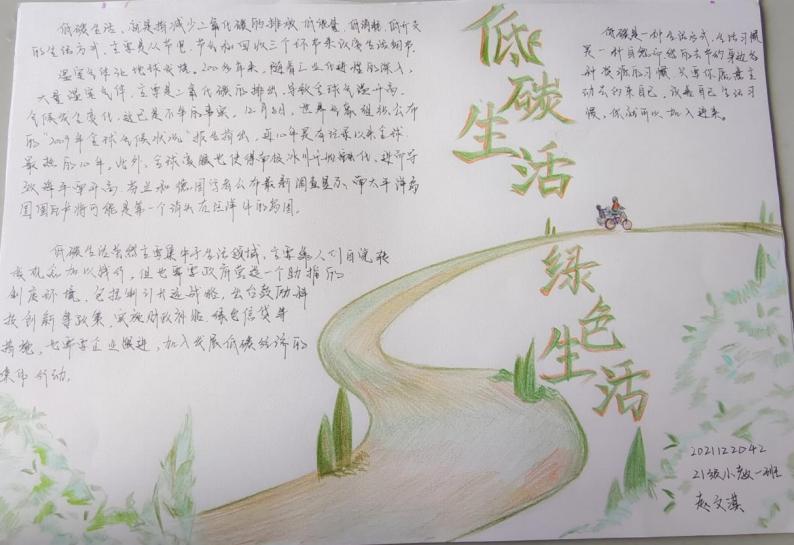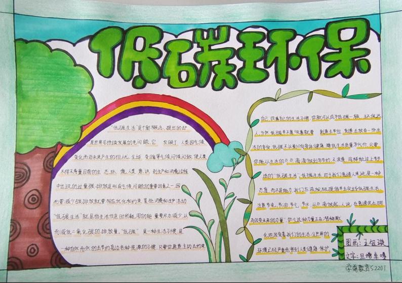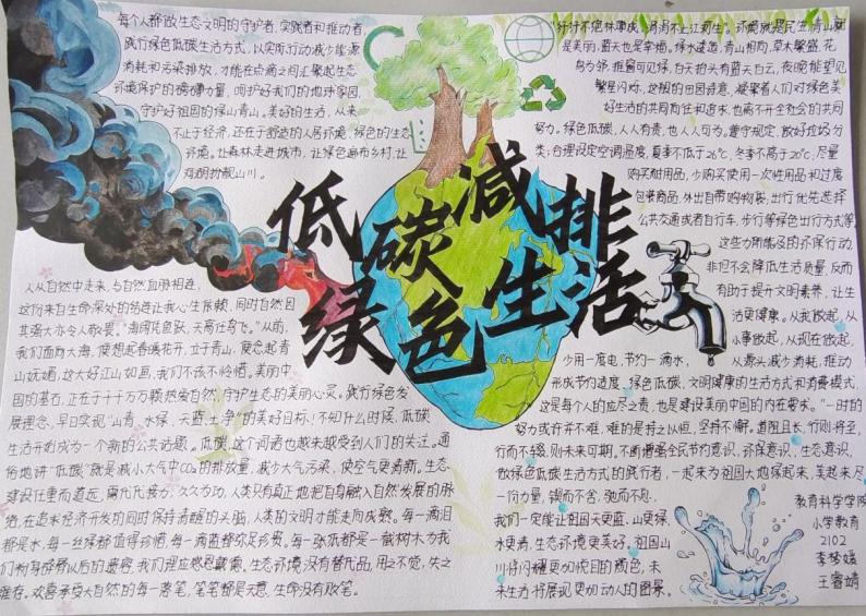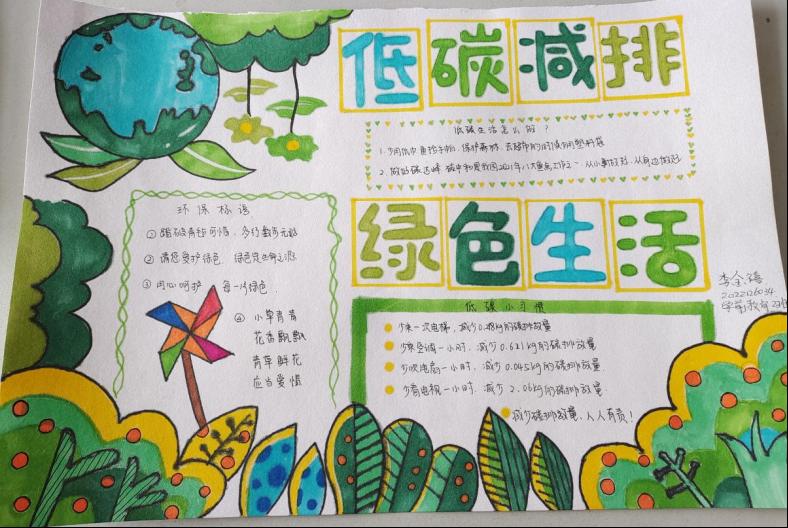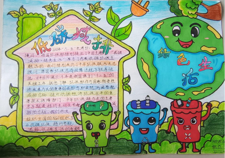 2101学前教育姚立洁荣获本次活动一等奖。她在手抄报中提到我们要积极响应环保部门提出的低碳环保主题“节能减排,绿色低碳“。姚立洁同学手抄报内容丰富,色彩鲜艳,整幅画面都透漏着绿色低碳的环保理念。