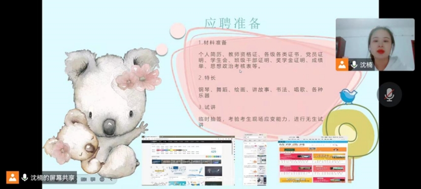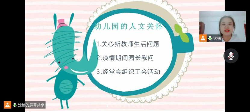 《学前教育专业师范生教师职业能力标准(试行)》(一下简称《标准》)中规定了学前教育专业师范生应具备师德践行能力、保育和教育实践能力、综合育人能力、自主发展能力四方面的教师职业能力标准。为有效贯彻落实《标准》、切实提高员工保育和教育实践能力、综合育人等能力,进一步培养复合型人才,明确学前教育员工毕业后的个人目标,确立员工的学习、就业方向。金年会金字招牌诚信至上学前教育专业于2023年5月11日18时30分,在线上举办一线幼儿教师经验分享交流会,其中会议由学前教育专业教师刘文婷主持,特邀18级学前教育专业优秀员工沈楠(现就职于佳木斯市第二实验幼儿园),为2020级学前教育全体同学分享考编经验、工作经验以及自己去杭州学习的心得。